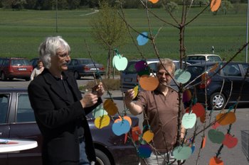 Keinen Weihnachtsbaum, auch keinen Maibaum, sondern einen „Wunschbaum“ hatte die Althengstetter SPD am Samstag vor dem Penny -Markt aufgestellt. Mit dieser Aktion wollte der SPD-Ortsverein Wähler und Wählerinnen auf die Kommunalwahl am 7. Juni aufmerksam machen. Bürgern und Bürgerinnen sollte Gelegenheit gegeben werden, ihre Vorstellungen, Anregungen und Wünsche an die kommunalen Räte zu äußern. Auf die vorbereiteten, apfelförmigen bunten Karten konnten diese geschrieben und in den Wunschbaum gehängt werden.