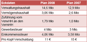 Aufgrund der aktuell vorliegenden Steuerprognosen ist es berechtigt, für den Vermögenshaushalt 2008 aus dem Verwaltungshaushalt eine Zuführung in Höhe von 1,8 Mio. einzuplanen. Der Vermögenshaushalt wird dann das stattliche Investitionsvolumen von rund 3 Mio. umfassen. Es bleibt jetzt auch etwas mehr für die Rücklage übrig, als ursprünglich gedacht und trotzdem können wichtige Investitionen angegangen werden: